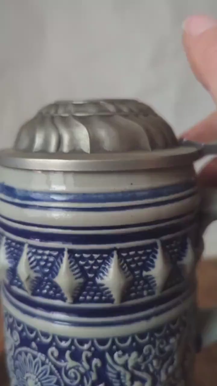 This vintage Bavarian ceramic beer stein features a classic cobalt blue relief pattern inspired by traditional German folk design. The detailed ornamental band and pewter lid reflect the heritage of Bavarian beer culture. A beautiful collectible piece for beer lovers, stein collectors, or rustic European kitchen decor.