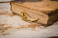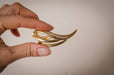 This is a vintage heart-shaped brooch made in the 70s that will make a simple, yet noticeable impact on anyone's outfit. The antique broach isn't overdone and has no over the top details - just a sleek goldish colored swirl design with a line of neat glass rhinestones. This retro statement brooch would look great with many fashion styles, mid-century in particular. Our brooch is a great woman present for those who like shawl pins or costume jewelry. This gold-tone collar pin or brooch would be a nice choice for rustic wedding decor, a Valentine's Day gift, or a Birthday present!
