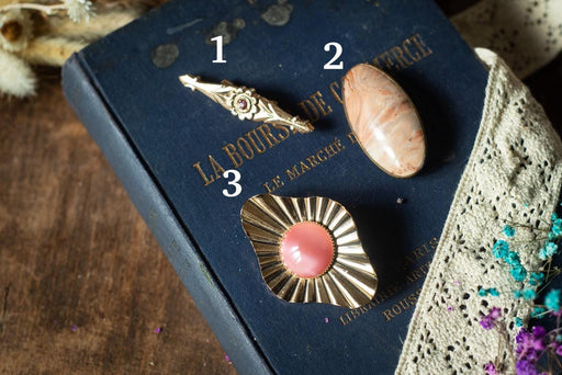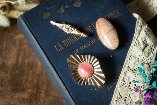 This vintage brooch collection features three distinct pieces: a filigree gold-tone brooch, a natural stone brooch, and a beautiful pink crystal br...