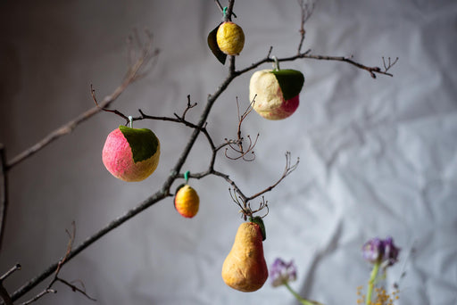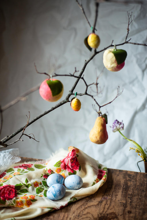 View full detailsPear and lemon spun cotton ornaments, Easter tree decor, paper mache fruits, vintage-inspired Easter figurines, rustic home decoration