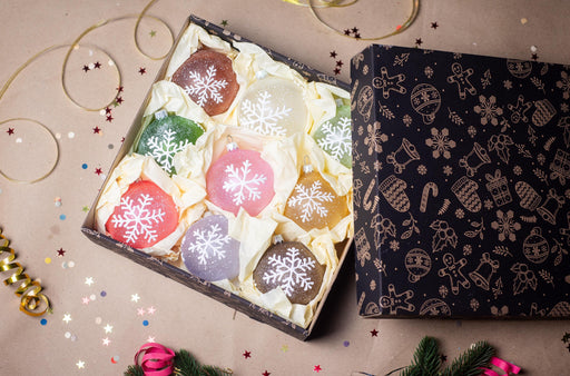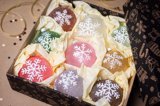 A charming set of 9 glass Christmas ornaments in soft pastel tones, each decorated with delicate white snowflakes. These baubles bring a cozy rusti...
