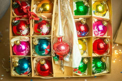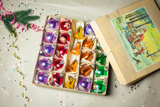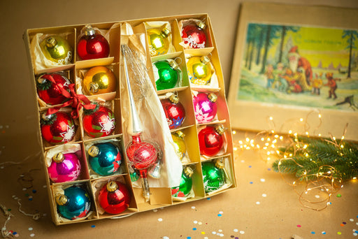 View full detailsSet of 24 GDR glass vintage Christmas ornaments, colorful decorations in original box, Xmas tree bohemian rainbow home decor