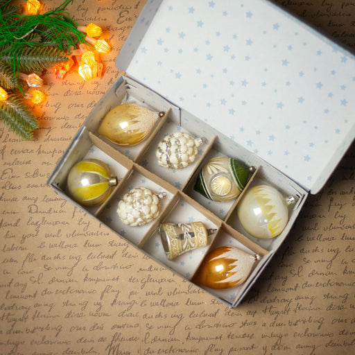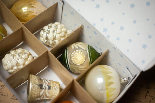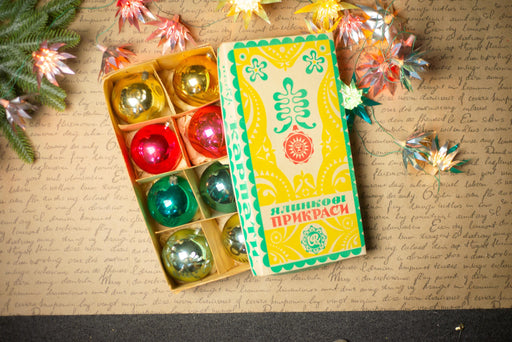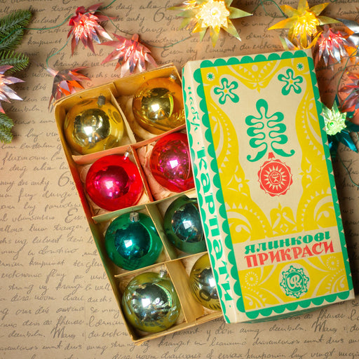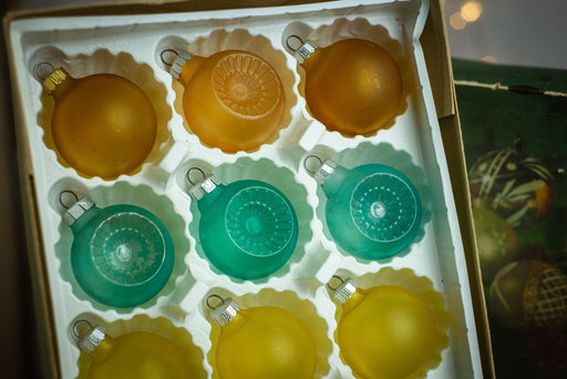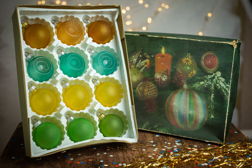 Beautiful set of 8 vintage glass Christmas ornaments from the 1970s, still in their original box. Featuring shiny baubles in green, red, and gold, ...