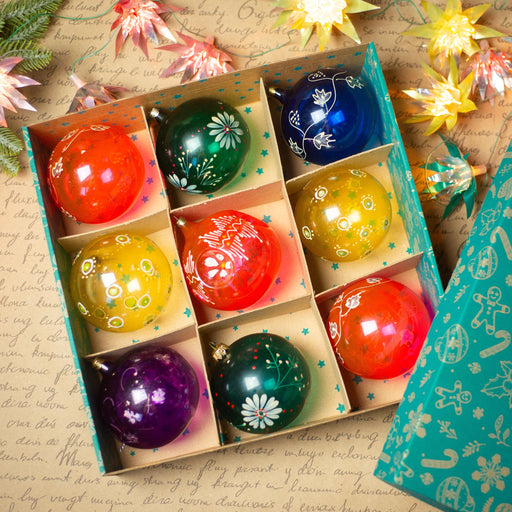 Beautiful vintage glass Christmas ornaments from the 1970s, available in sets of 8 or 12. Each bauble features vibrant colors with hand-painted whi...