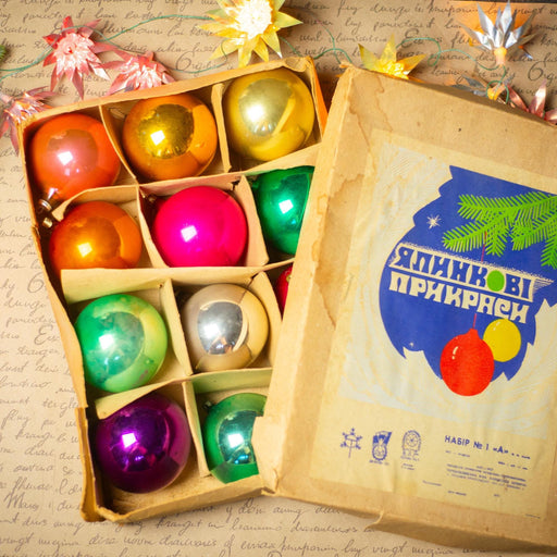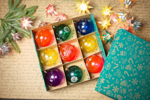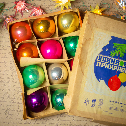 View full detailsVintage Glass Christmas Ornaments Set in Original Box, Multicolor Balls, Mid Century Xmas Decor