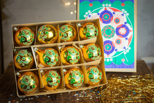 Add a warm golden glow to your holiday decor with this set of vintage glass Christmas ornaments. Featuring 12 elegant baubles with a hand-painted g...